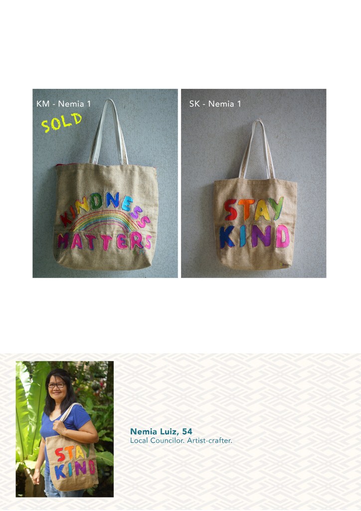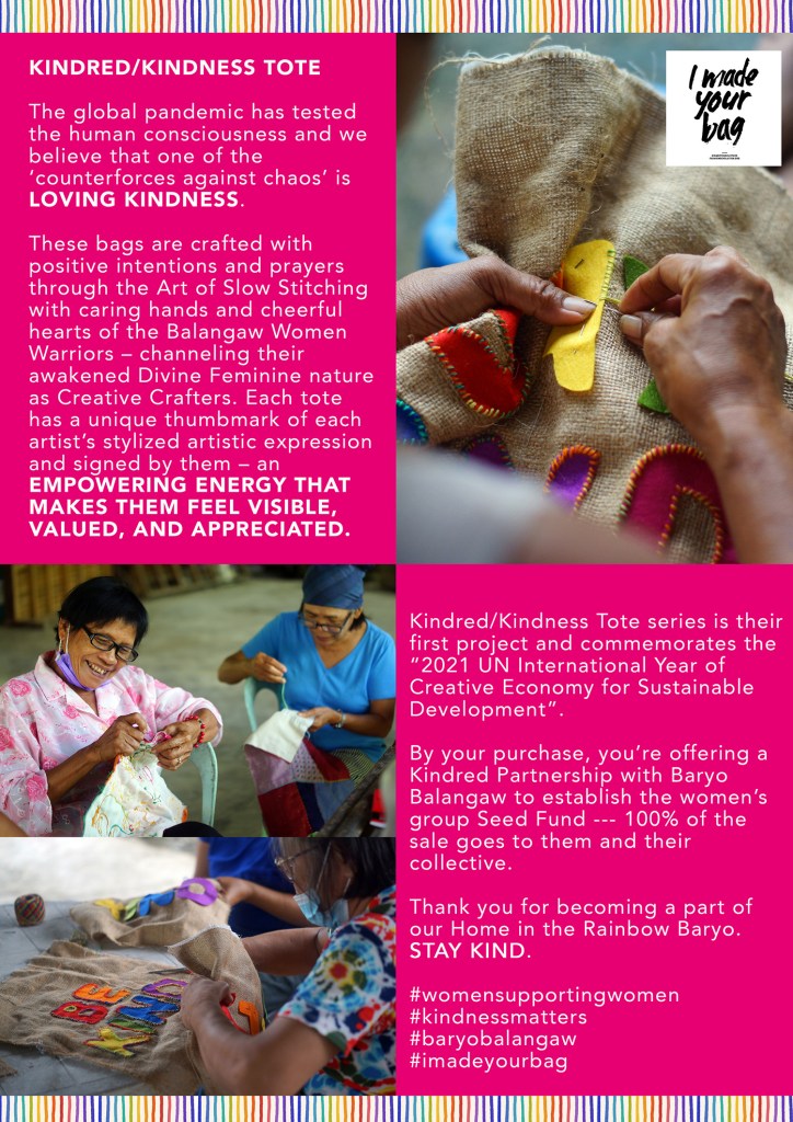 Kindred/Kindness Tote series is their first project and commemorates the “2021 UN International Year of Creative Economy for Sustainable Development”.